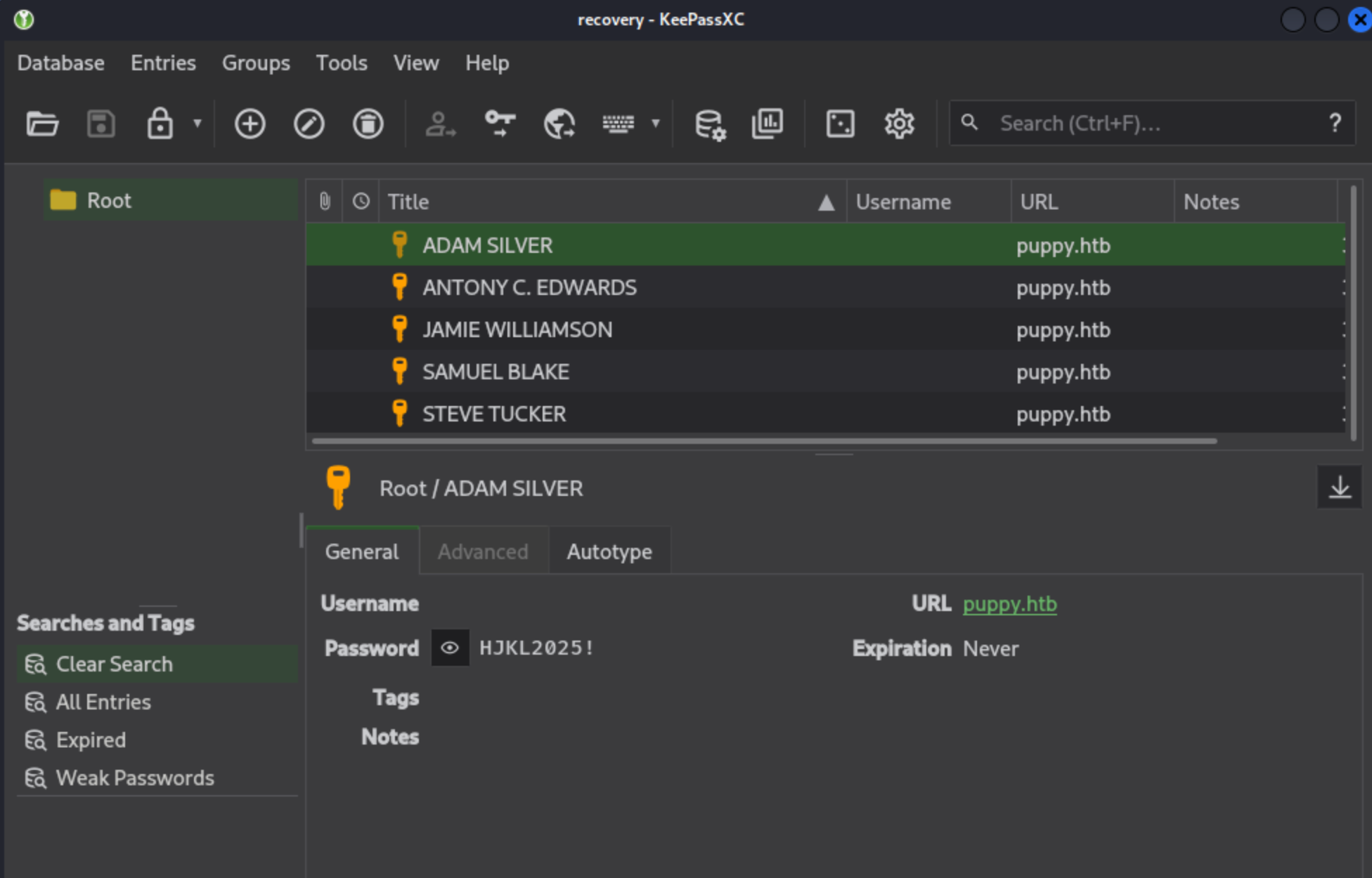 [2025-09-27 21:58:23] [Set-DomainUserPassword] Principal CN=Adam D. Silver,CN=Users,DC=PUPPY,DC=HTB found in domain
