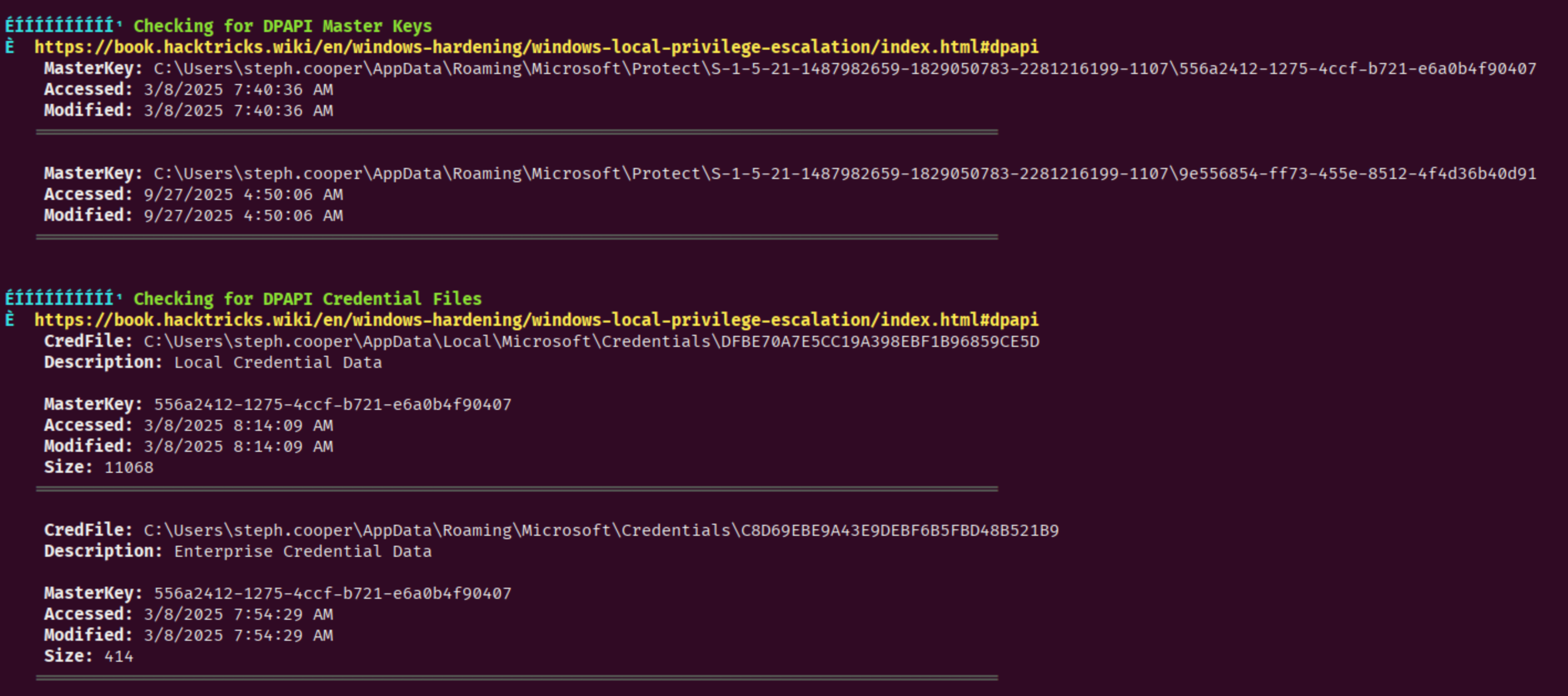 I ran winPEAS and found the DPAPI credentials stood out. DPAPI (Data Protection API) is used on Windows to store credentials from browsers, Outlook, Vault, Windows Credential Manager, and etc. Typically applications that have “remember me” features will use DPAPI to encrypt the user’s passwords before storing them.